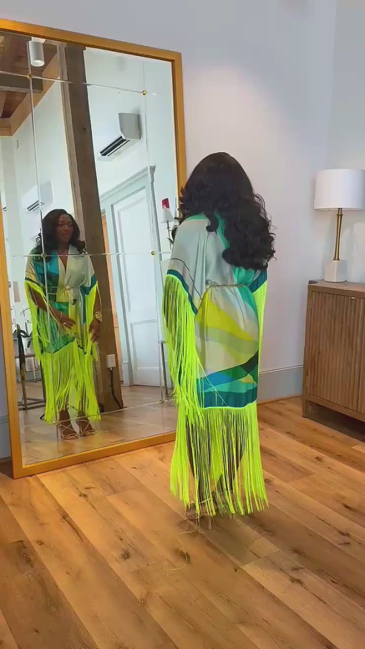 Make a bold entrance with the Limelight Luxe Kimono Dress in Neon Green Fringe. Made from soft, durable polyester, this dress offers both comfort and eye-catching style. Its elegant kimono design drapes beautifully, while the vibrant neon green fringe adds dynamic movement and vivid flair. Perfect for turning heads at any occasion, this dress effortlessly blends classic sophistication with modern excitement.